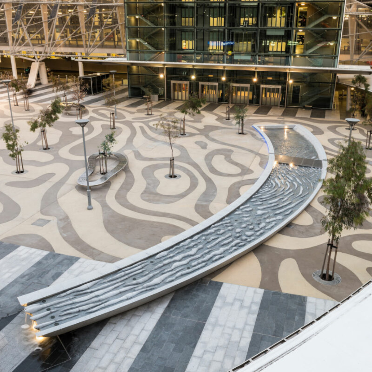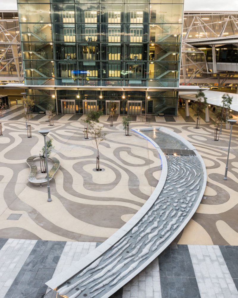 Water is a precious and at times intermittent element in the South Australian landscape – the driest state in the driest continent in the world. The sculptural water feature Watercourse takes its inspiration from the creeks that flow through this often parched environment and acts as a poignant reminder of the life-affirming presence of water.