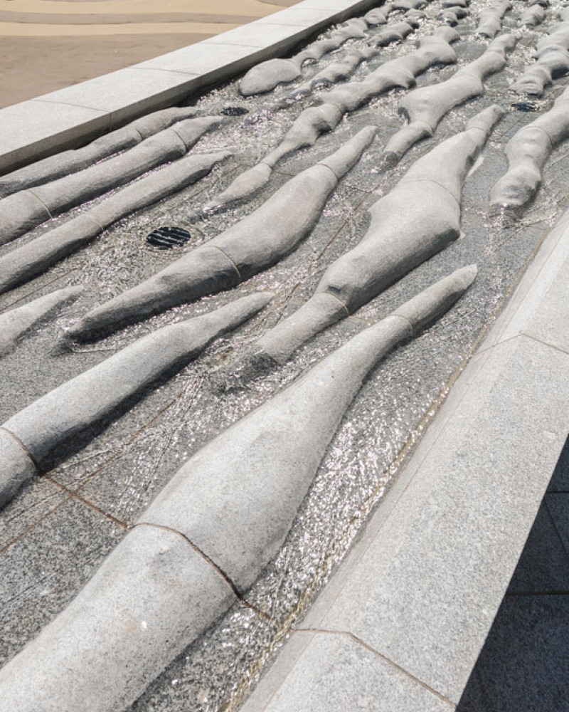 The water feature is further animated at the terminal end by a waterfall, which contributes a soothing sound to its surroundings. The generous sides of the water feature provide seating opportunities while the bridge at the western end allows for easy access across the plaza.