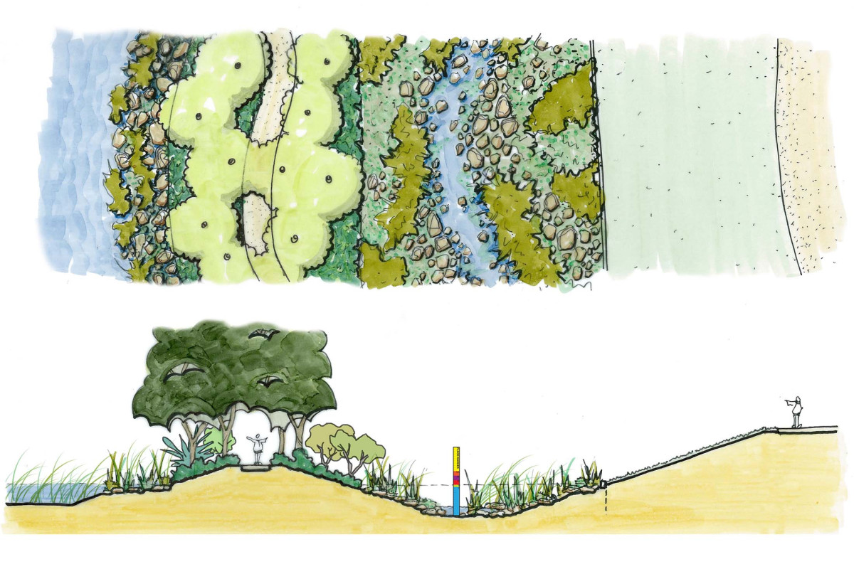 The conceptual design process has led to a fusion of engineering, landscape architecture and interpretation resulting in an integrated system combining physical, biological, mechanical and hydrological processes.