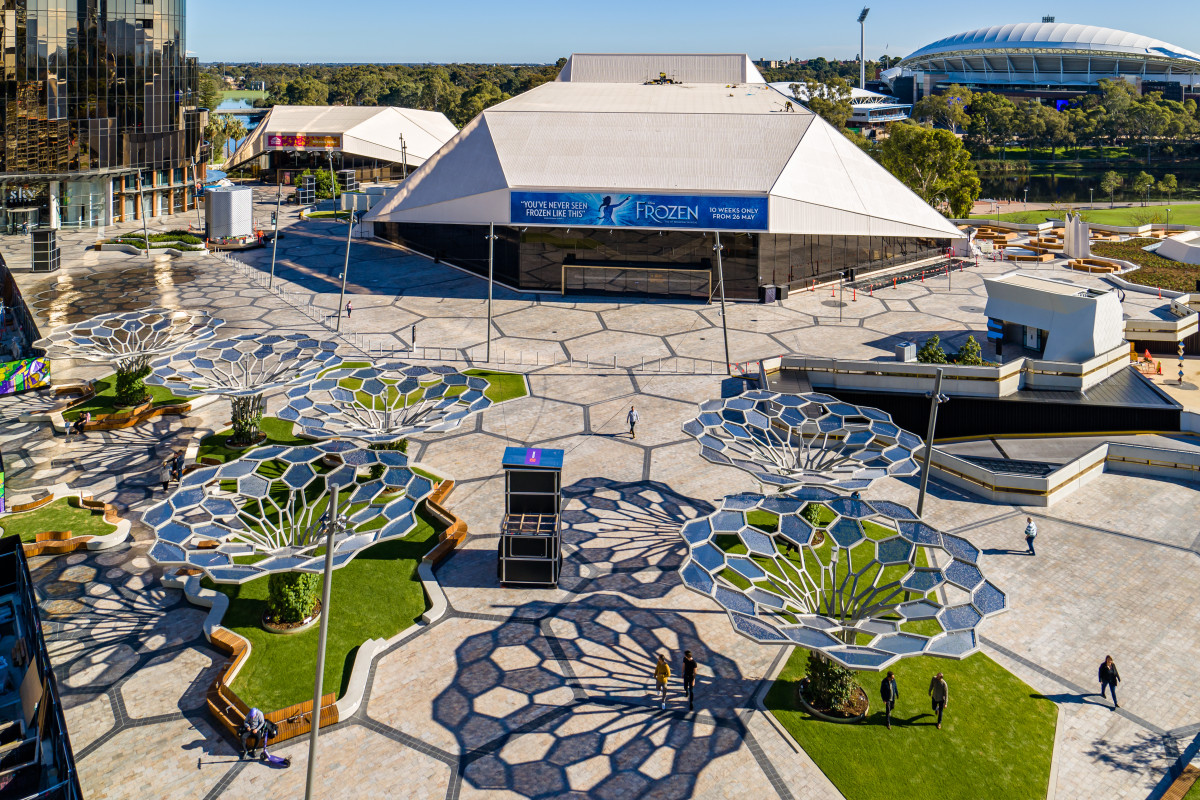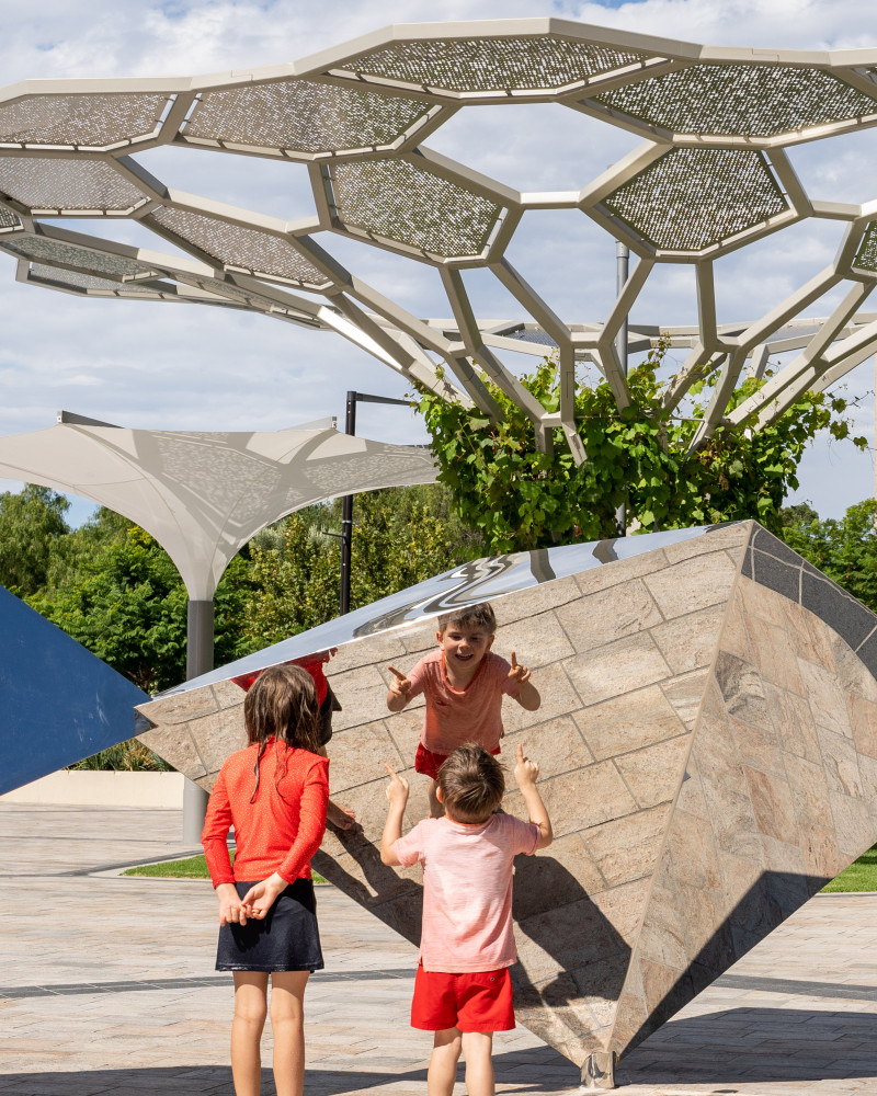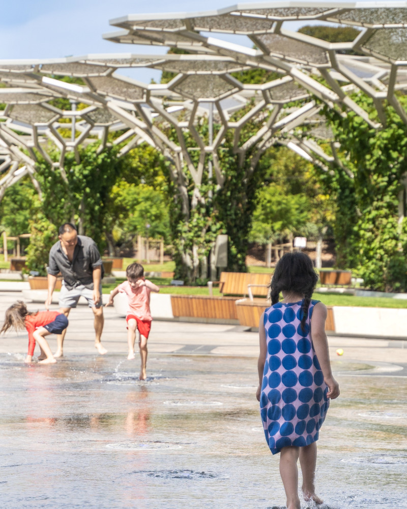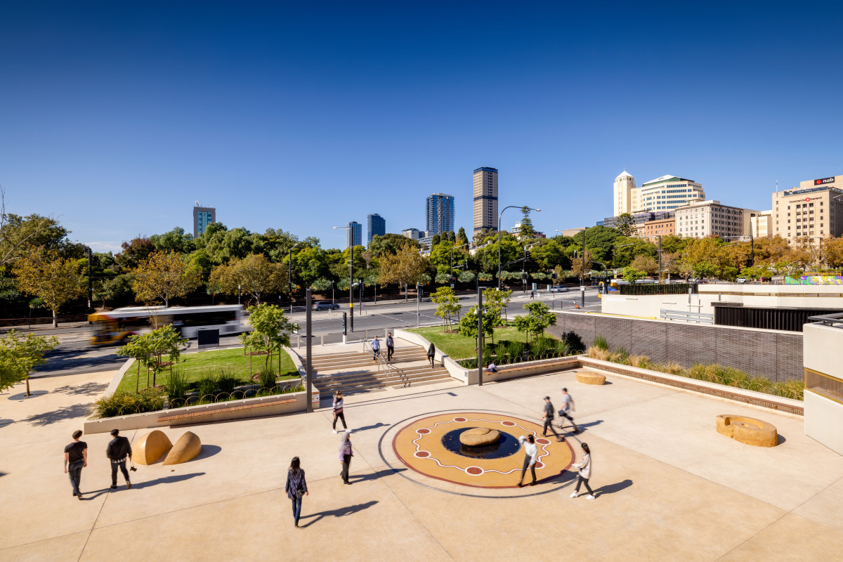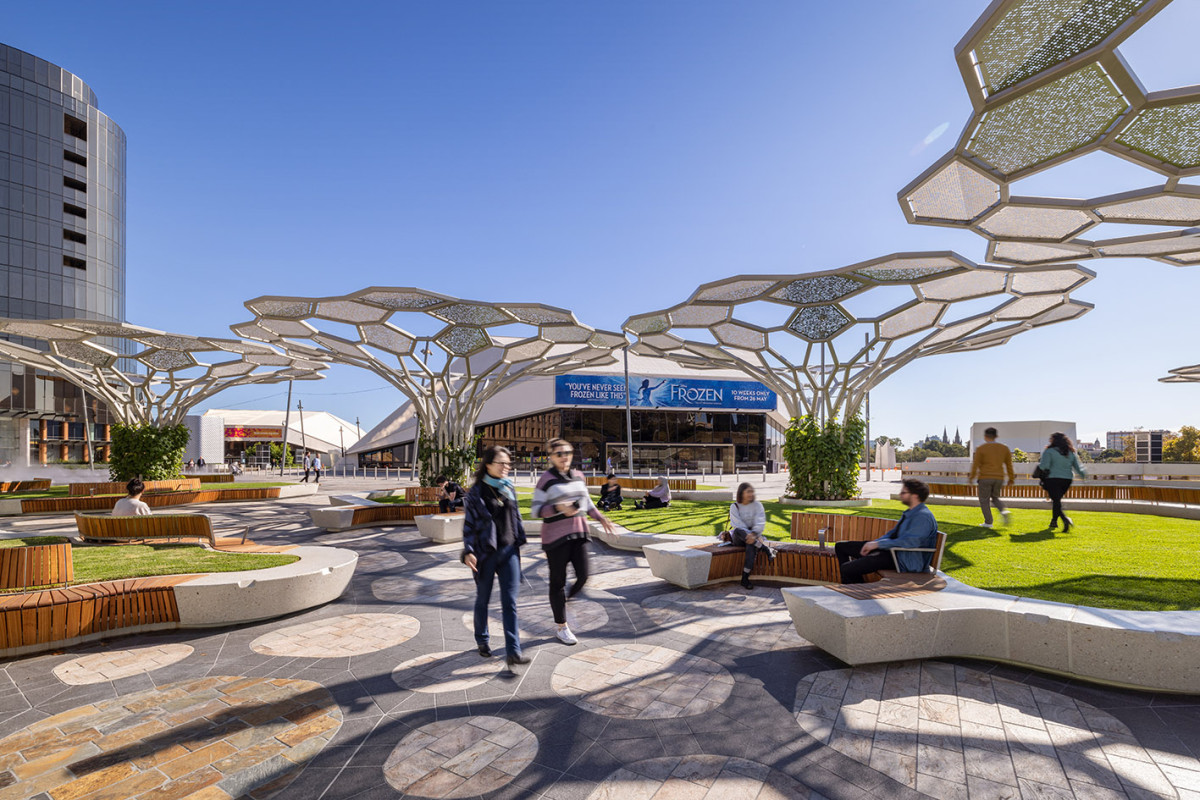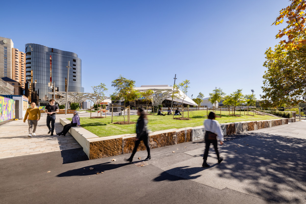 Festival Plaza is Adelaide’s largest public realm project of recent times. A significant part of the Riverbank Precinct Masterplan, the new plaza stitches together Adelaide’s major events and entertainment precinct including the Adelaide Festival Centre, Sky City Casino, Adelaide Railway Station, Parliament as well as a new mixed-use retail and office tower. At approximately 2 hectares in size, the plaza’s design speaks to the modernist heritage of the Festival Centre, with an expansive events space of signature Australian stone paving fringed with shaded lawns and gardens. The water feature is a centrepiece, providing a playful, cooling element and year-round activation.