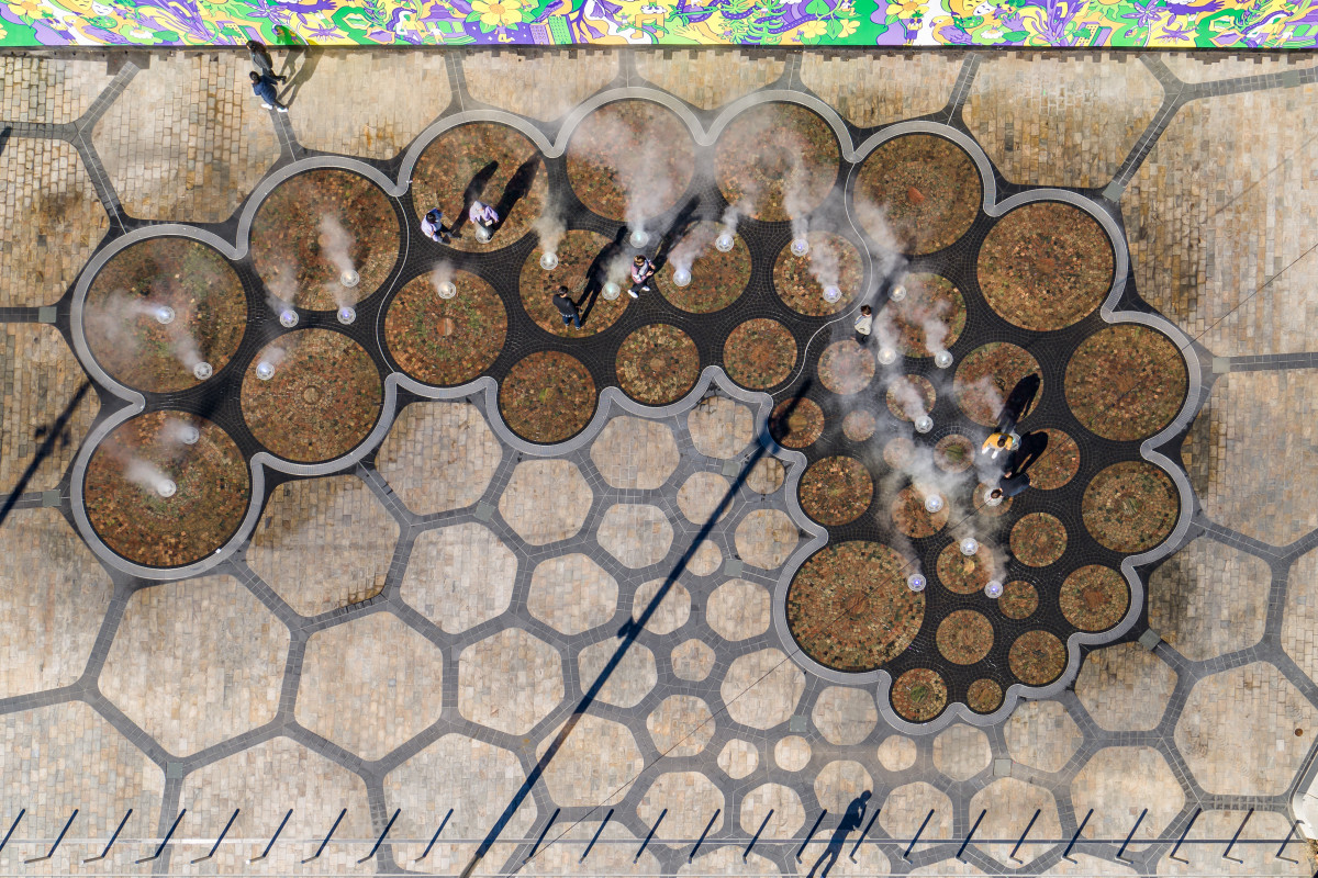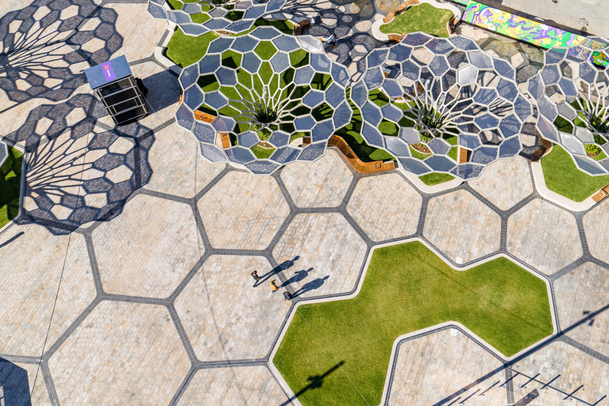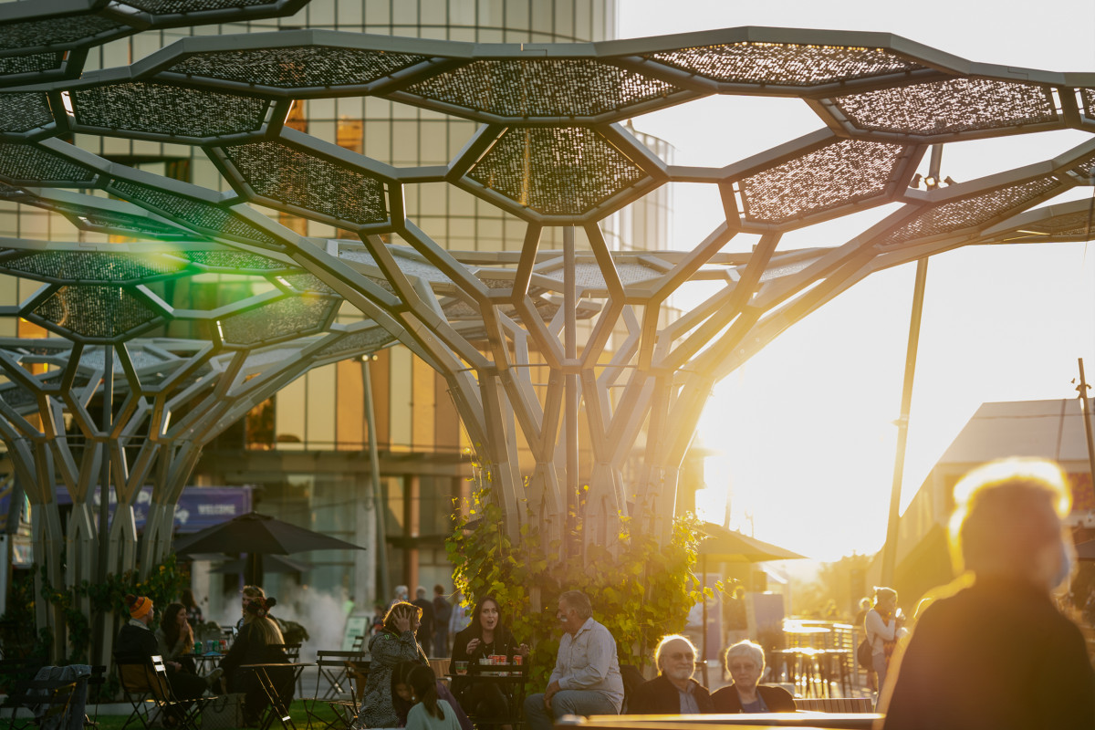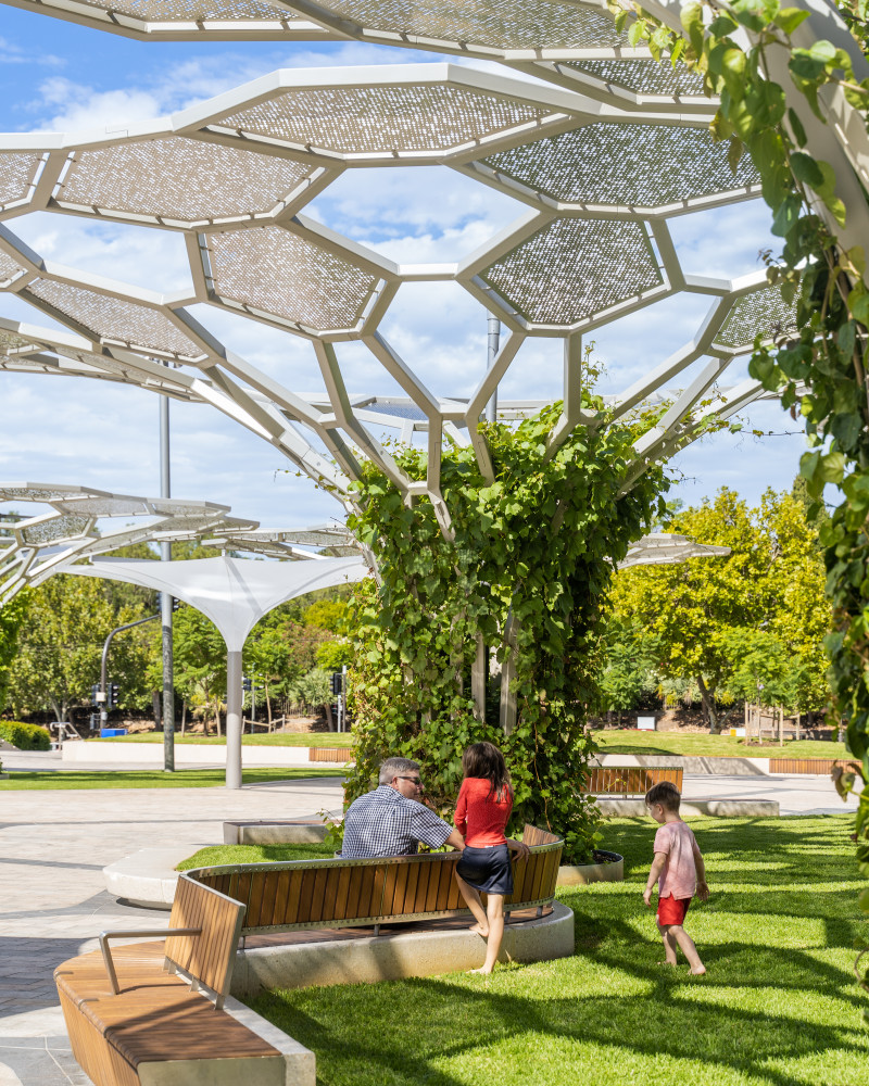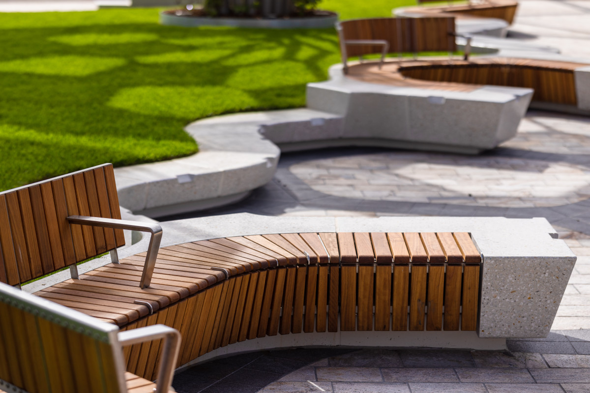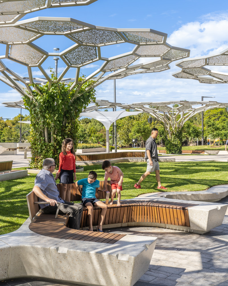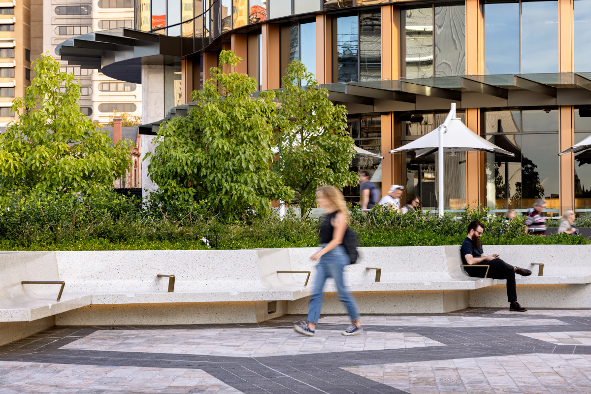 Festival Plaza is Adelaide’s largest public realm project of recent times. A significant part of the Riverbank Precinct Masterplan, the new plaza stitches together Adelaide’s major events and entertainment precinct including the Adelaide Festival Centre, Sky City Casino, Adelaide Railway Station, Parliament as well as a new mixed-use retail and office tower. At approximately 2 hectares in size, the plaza’s design speaks to the modernist heritage of the Festival Centre, with an expansive events space of signature Australian stone paving fringed with shaded lawns and gardens. The water feature is a centrepiece, providing a playful, cooling element and year-round activation.