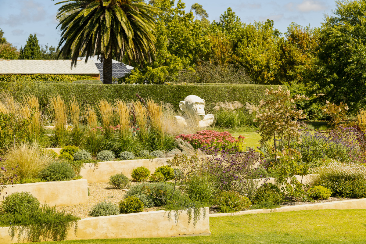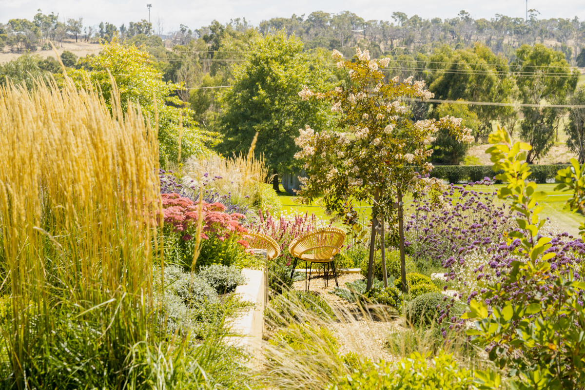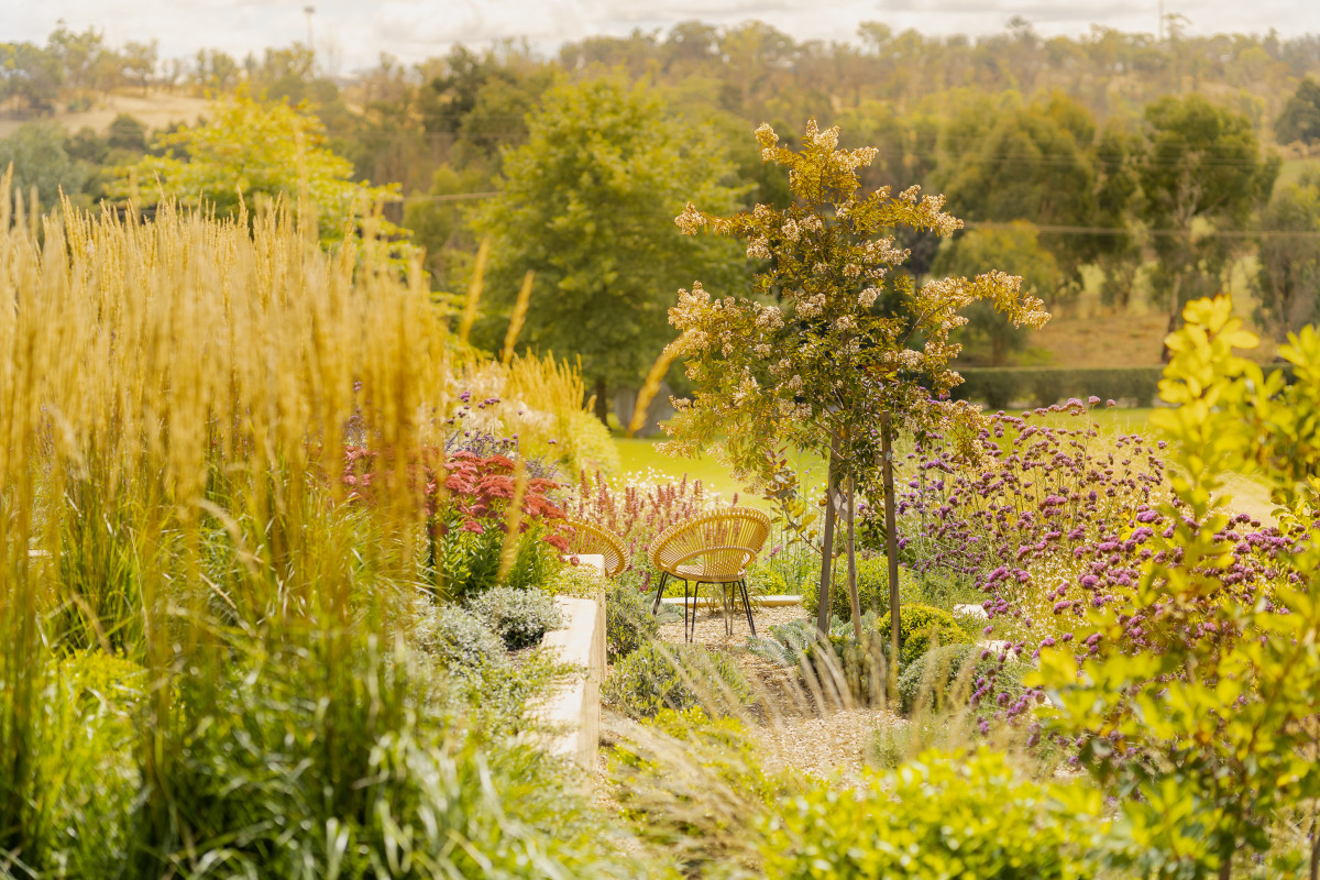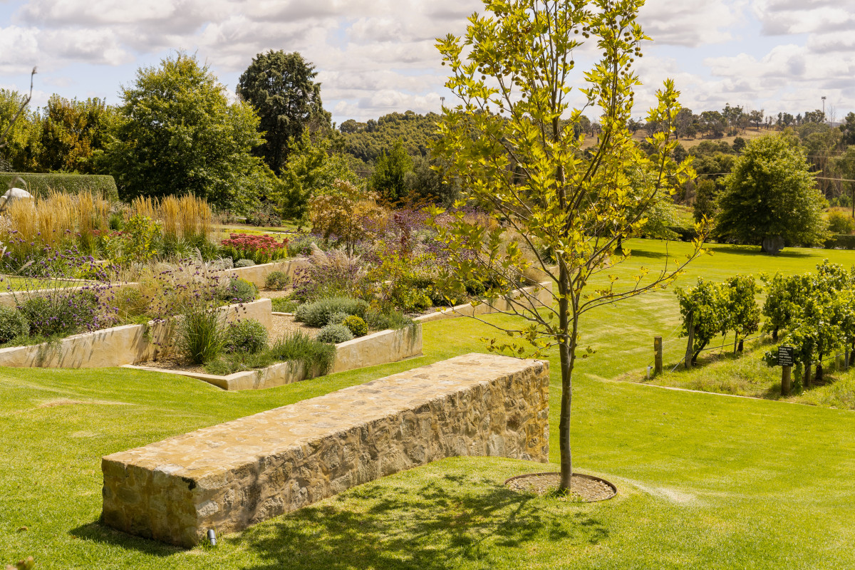 A large area of grass on the upper terrace allows for gatherings, while a series of elegant sawn limestone stone steps traverse down the slope to the lower sections of the site.
