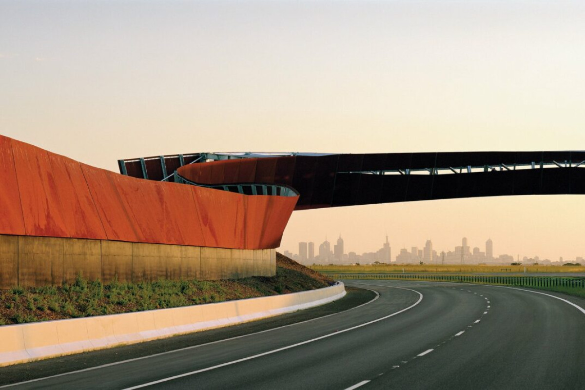 Without resorting to the creation of a gateway as an object, the designers have sequenced elements in a sculptural, almost theatrical way to reveal views of the city. Sculpture, landforms and road infrastructure elements, including a sinuous weathered steel curtain wall, moulded concrete sound walls, etched acrylic panels, tapered blue poles, LED lighting and, ultimately, a twisted steel pedestrian bridge that frames the Melbourne skyline, have been carefully arranged and integrated within the road corridor to create a five-kilometre gateway experience that is at once dynamic, sequential and memorable.