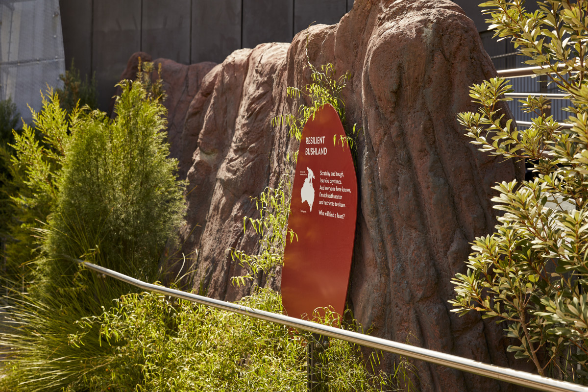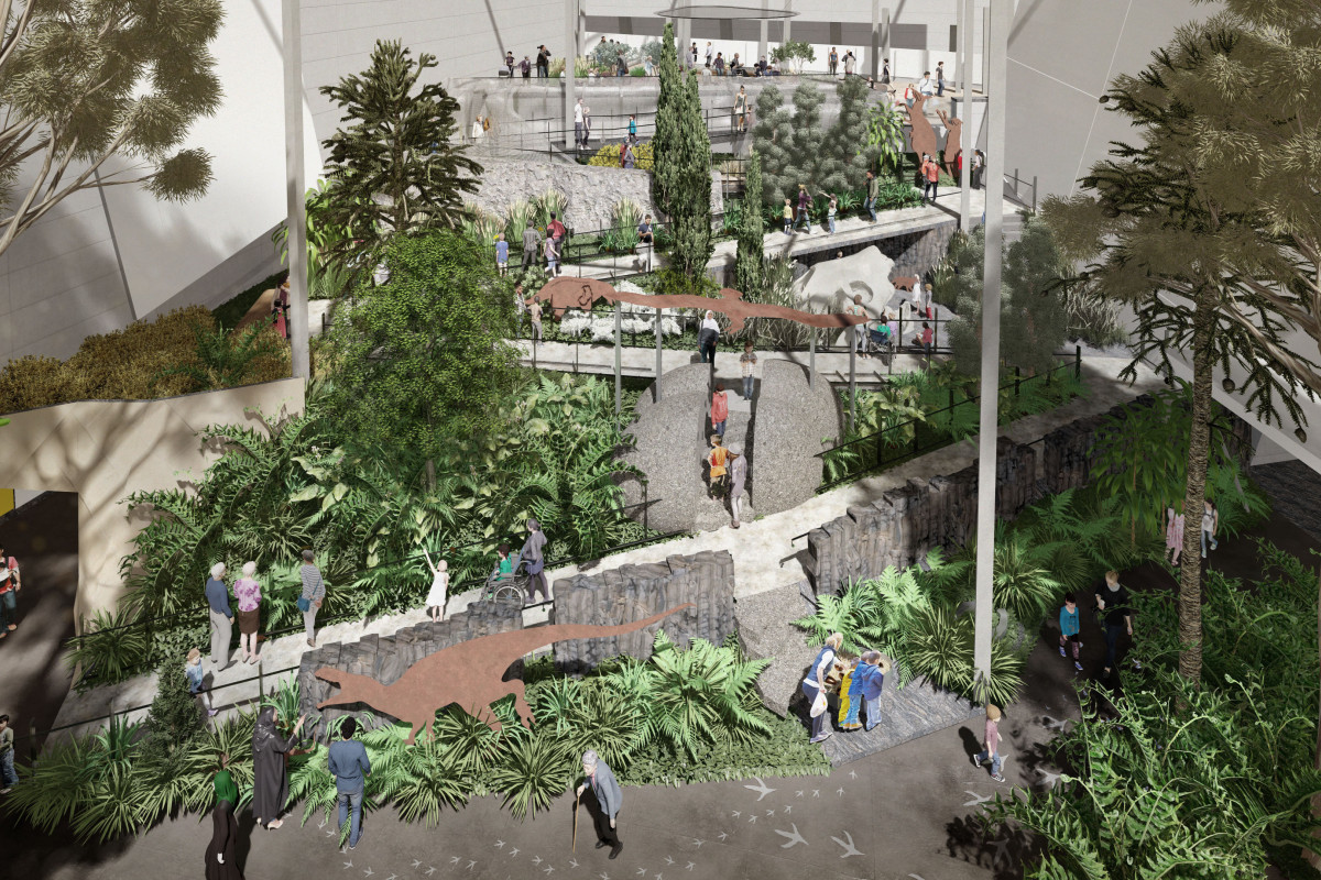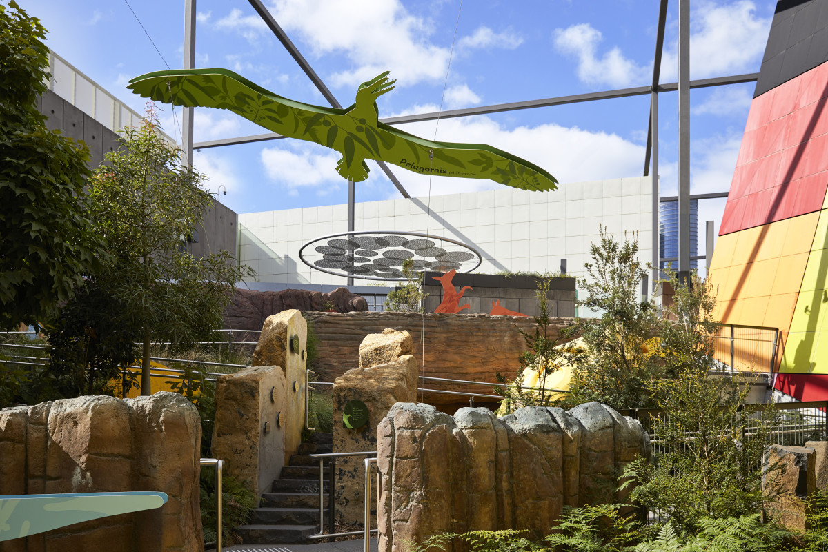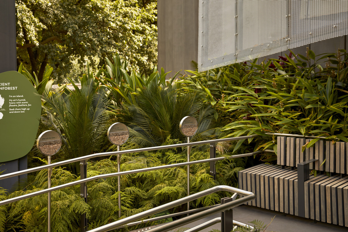 Fitted within two existing Museum buildings, an accessible ramp winds down the site, creating ‘slices of time’. Each slice features a distinctive landscape, interactive elements, and art pieces to engage and excite visitors of all ages. The journey through the Gondwana Garden is colour-coded to enable the user to easily connect with the interactive digital application developed by the Museum and understand the context of the replica fossils within the exhibit.