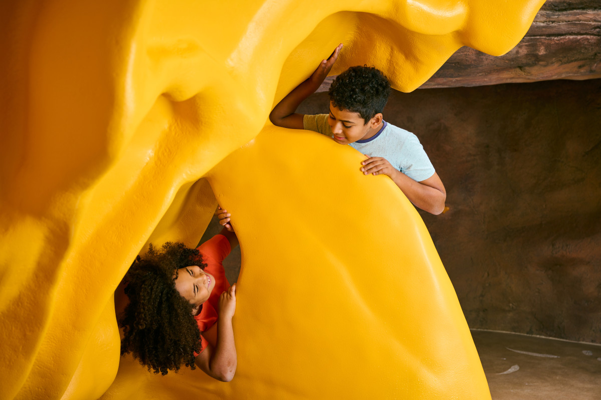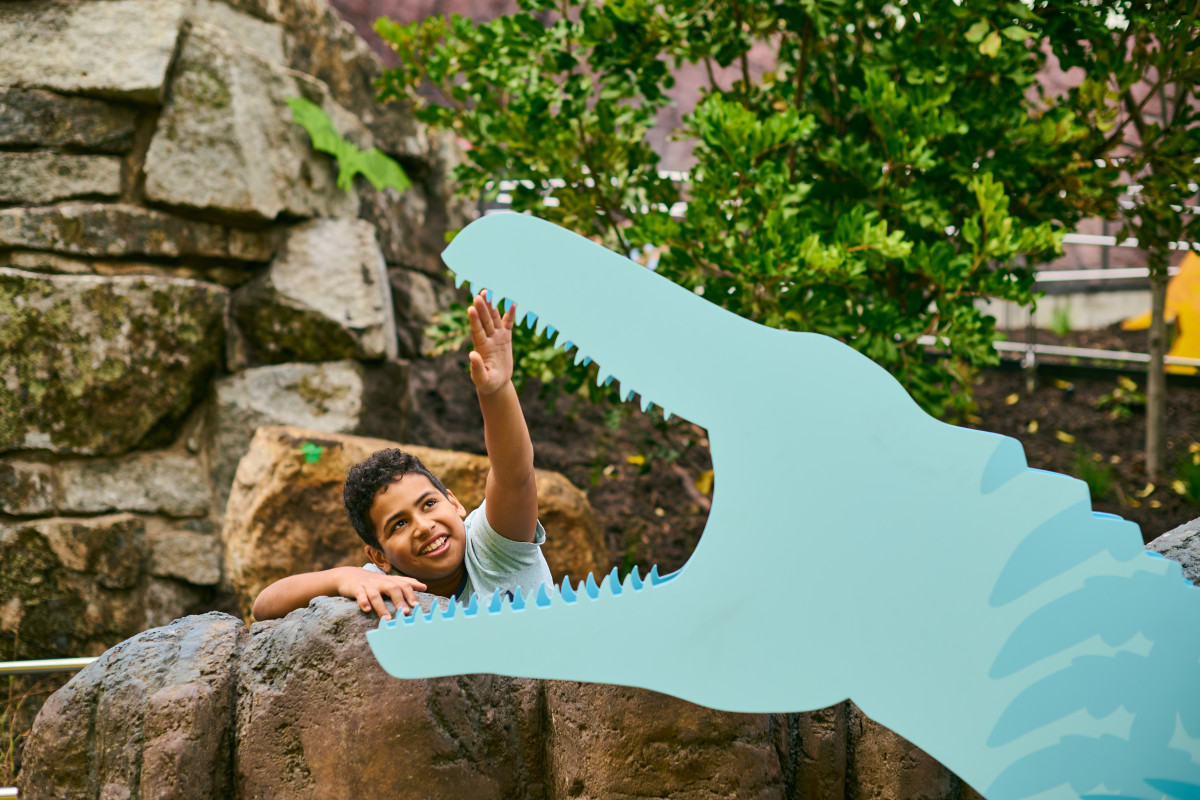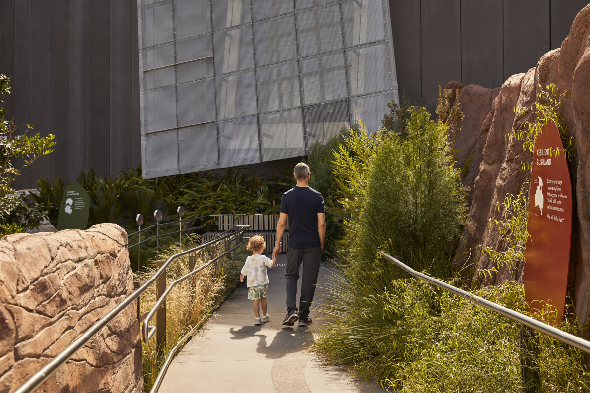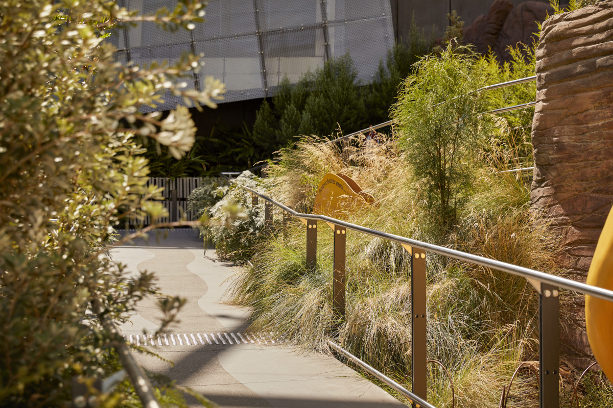 Fitted within two existing Museum buildings, an accessible ramp winds down the site, creating ‘slices of time’. Each slice features a distinctive landscape, interactive elements, and art pieces to engage and excite visitors of all ages. The journey through the Gondwana Garden is colour-coded to enable the user to easily connect with the interactive digital application developed by the Museum and understand the context of the replica fossils within the exhibit.