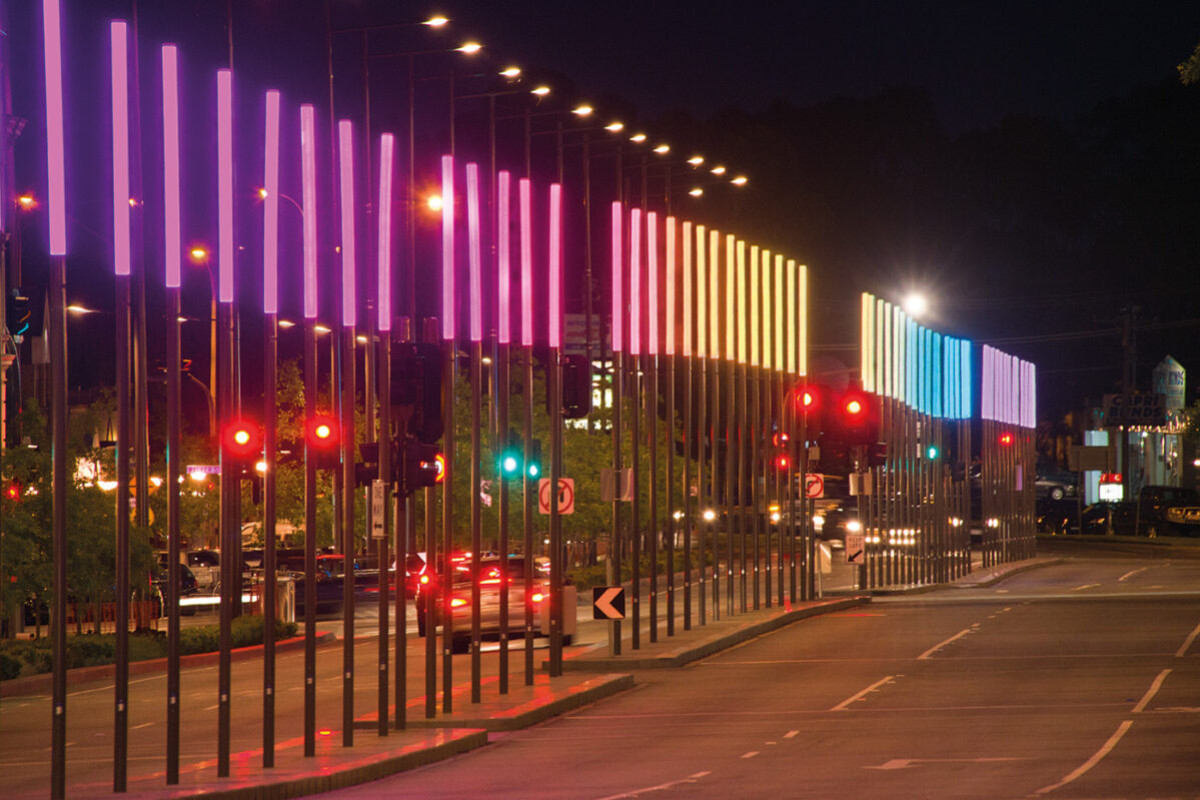 An integrated artwork designed in collaboration with artist Daniel Sequeira and Electrolight is composed of vertical lighting rods and forms the centrepiece to the Lonsdale Street experience.