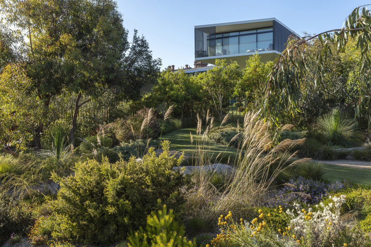 The immersive and layered garden provides privacy from the adjacent houses while affording views to the river landscape.