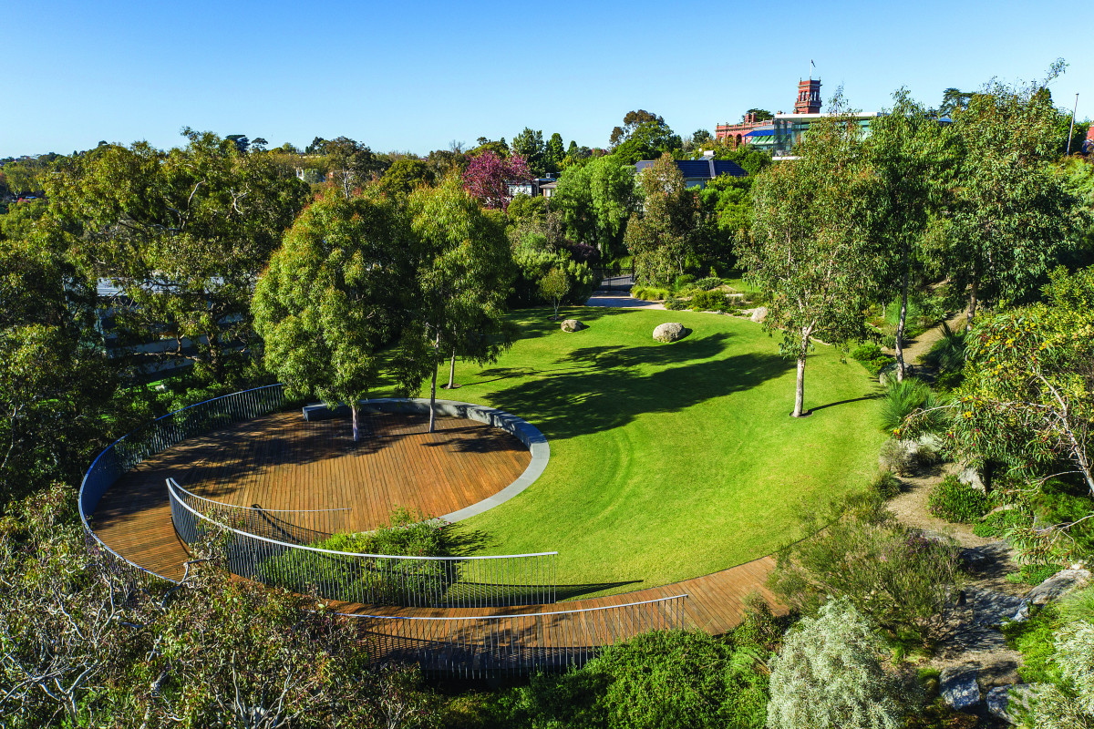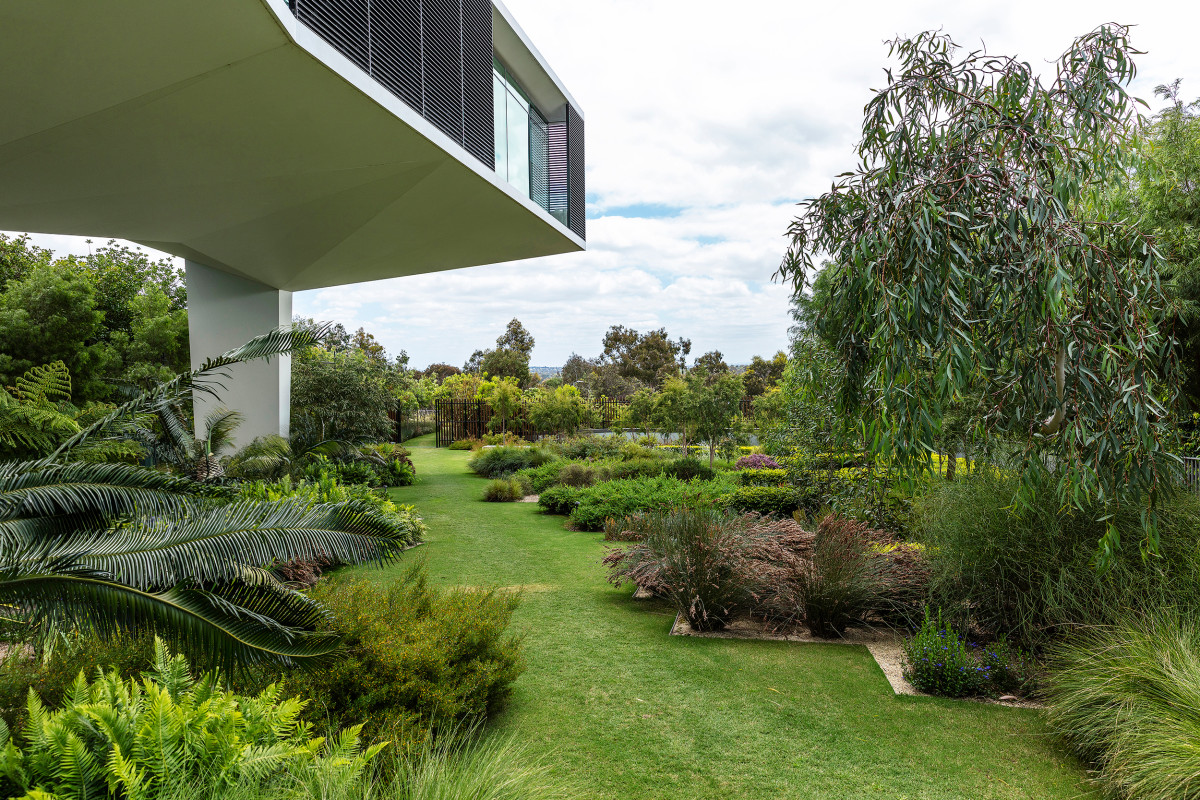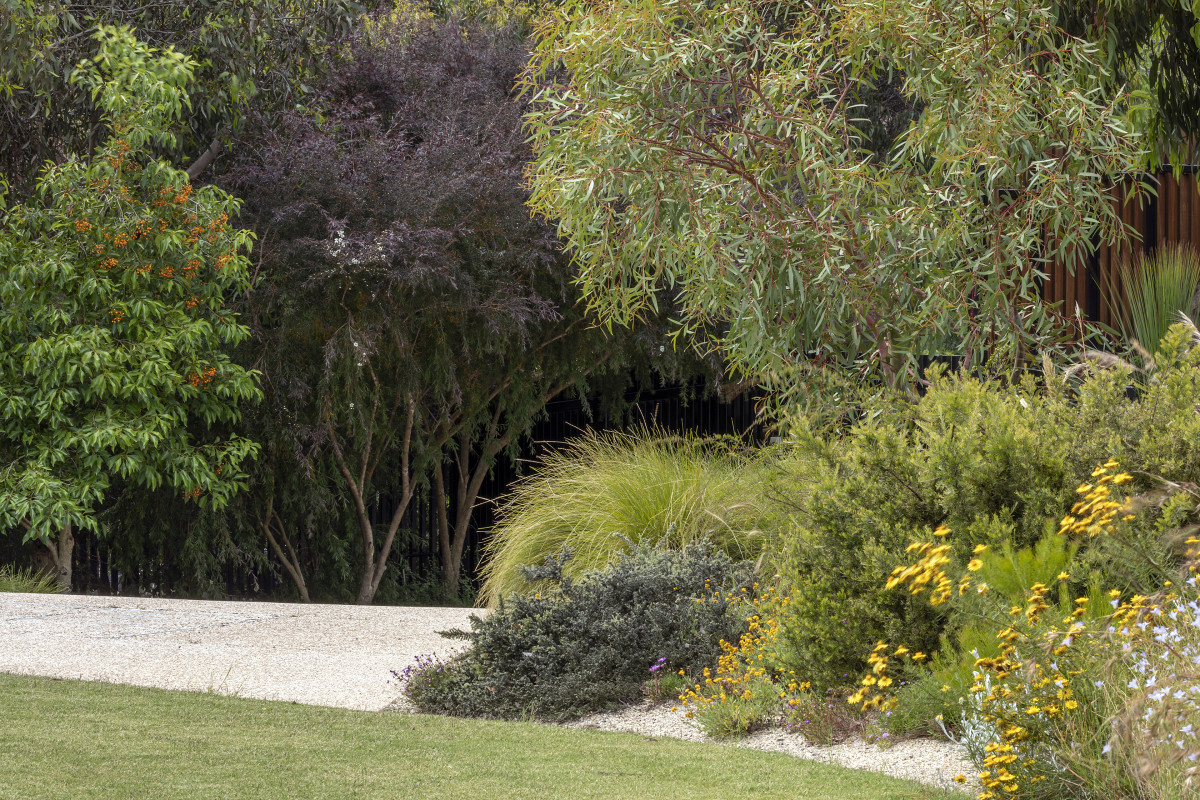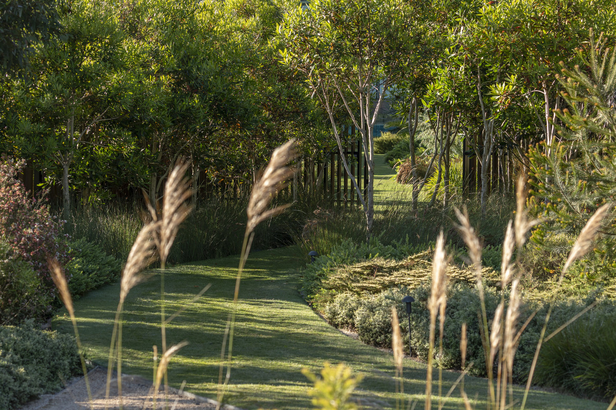 An immersive forest of Tristaniopsis laurina creates a transition to the informal lower garden that includes a generous events lawn and deck surrounded by the bio-diverse garden with meandering pathways.