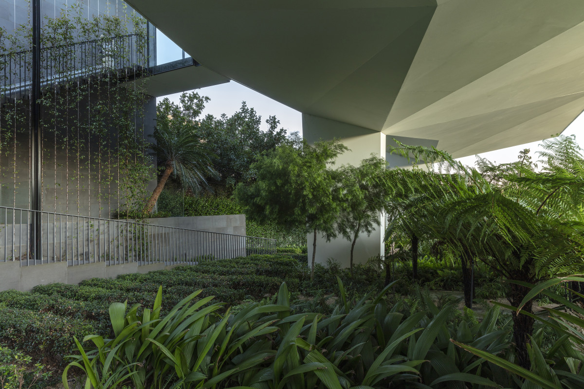 A contemporary addition on tall pillars creates an under-croft microclimate for a lush fern planting below. Pioneer plantings of floriferous Acacia and Myoporum cultivars offer early protection and visual effect- these will be removed as the slower long-term framework develops.