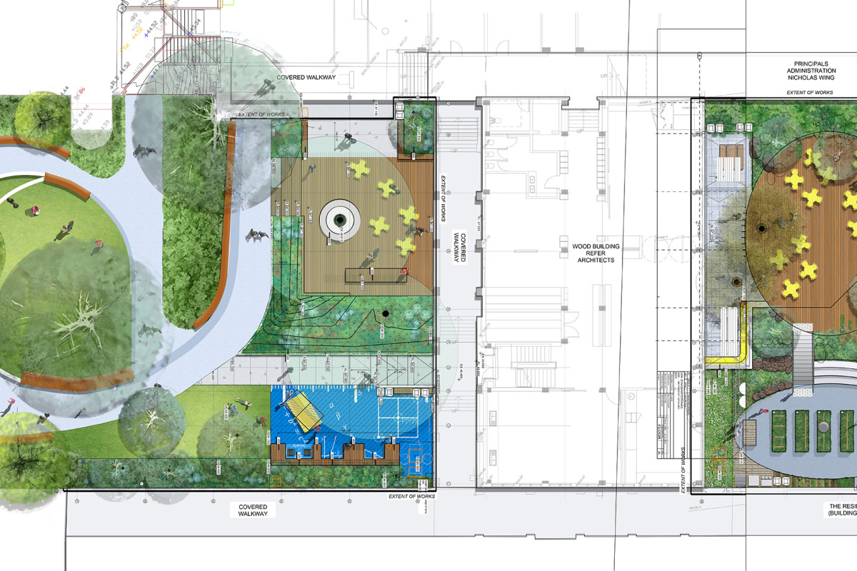 The three courtyards were designed as unique expressions for the school within a single project. The development of the Dr Wood Learning building by McIldowie Partners enabled the landscape to be progressively redeveloped responding to the contemporary learning pedagogy both inside and outside.