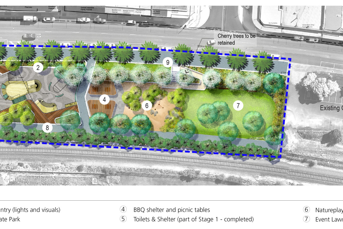 The multiple skill level zones ensure the skate park is accessible to all levels of skating ability. The family area hosts a double bbq and large communal outdoor dining area. Just like the book The Little Crooked House, the new playground has been built right on the edge of the railway track enabling all to enjoy play, train watch and nature play in this new play zone. The event lawn with multiple seating opportunities, and new permitter garden that will grow over time.