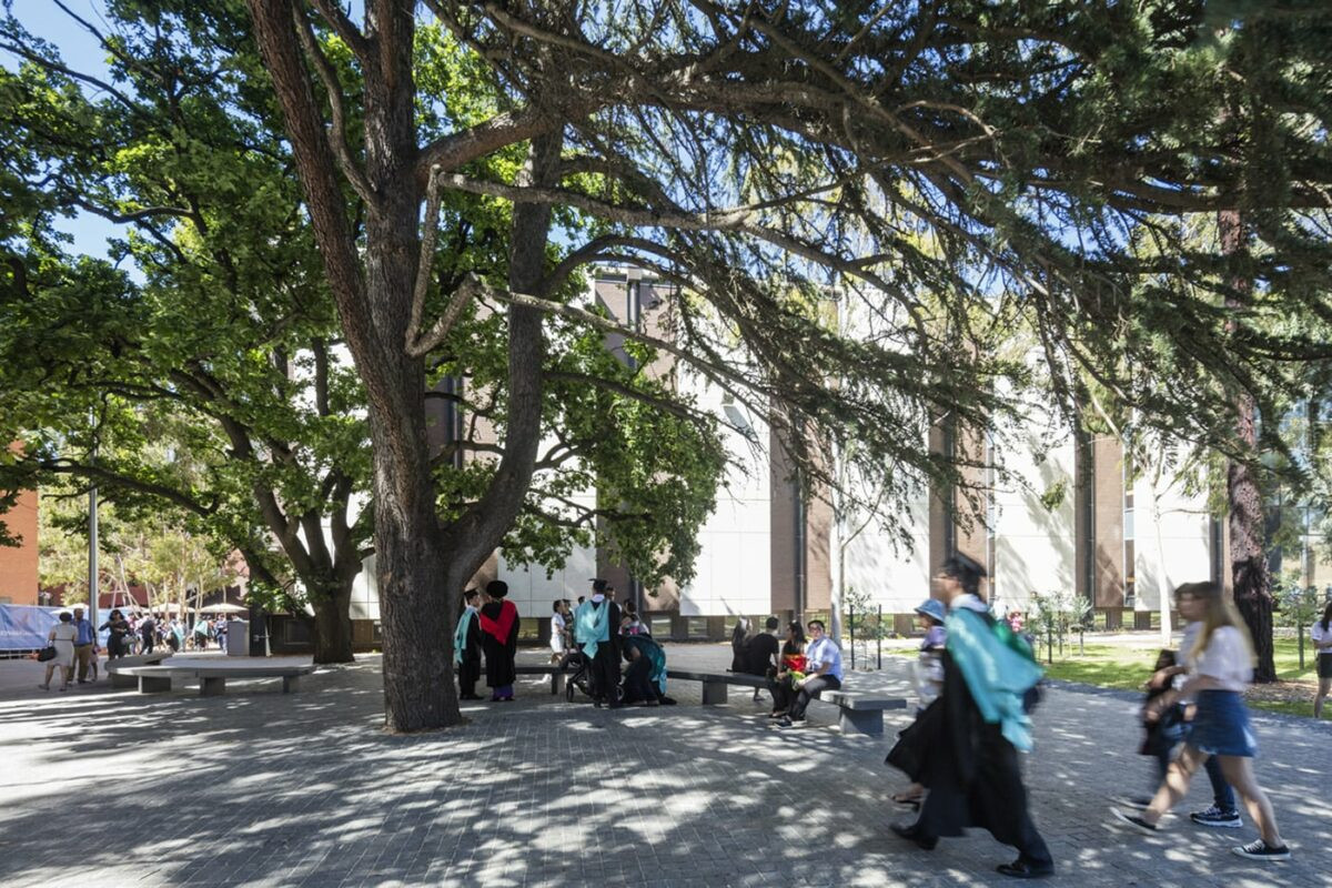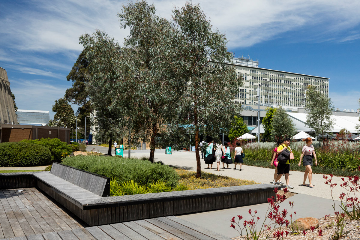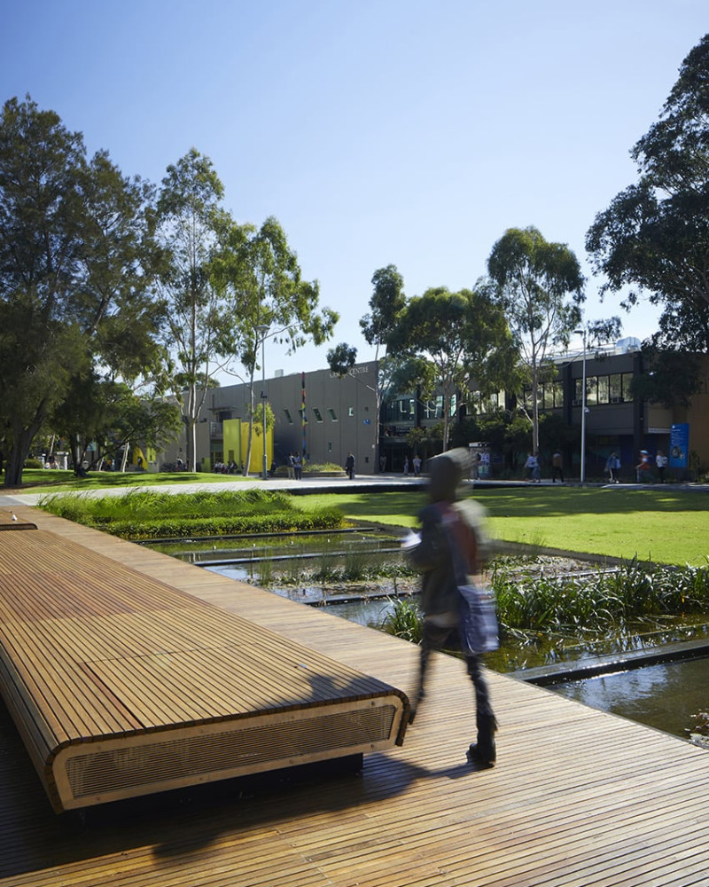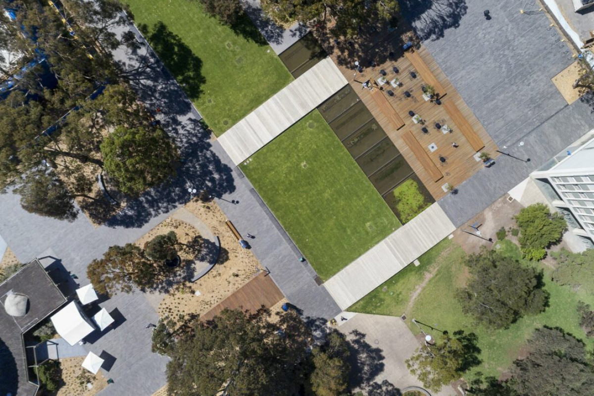 Awarded as part of a two-stage competition, this project was designed and delivered by TCL with Peter Elliott Architecture and Urban Design.The design of the Forum, Monash Clayton’s premier ceremonial space, was based around three key moves: to edit out compromised elements; re-establish the fundamental structures of the space; and then insert new elements. The editing process saw the removal of selected trees and the ‘de-cluttering’ of the space – removing built form intrusions particularly steps and ramps, and extraneous pathways, to provide a new seamless and accessible integration between building entries and open space.Established as a single plane, the space has clarity and is reinforced in its ‘civic-ness’. The grand new sunken lawn is the centrepiece of the Forum, bordered by strong axial pathways. A sequence of bridges connects the paths across the lawn and reference Sir John Monash’s contribution to bridge engineering. The original pond has been reimagined as a formal, naturally-filtered water feature. The new Forum provides a memorable backdrop for graduation, events, and daily university life.