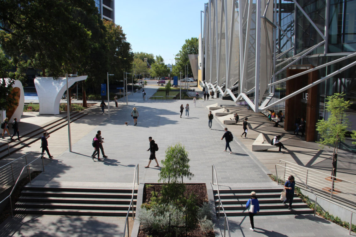 Queens Walk is located at the heart of Monash University’s Caulfield Campus. As part of the implementation phase of the wider campus masterplan, the design for Queens Walk stitches the recently completed Campus Green to the refurbished library (by JWA) and Eastern Arts Precinct via a strong north-south pedestrian link.The design transforms an existing road into a social and dynamic space through its connection to a series of activity areas, such as cafes, outdoor workshops and retail outlets. This will provide clear legibility throughout the site and provide a fully integrated pedestrian network.A strong sense of arrival is created from Sir John Monash Drive with a wide, planted staircase that leads up to the heart of the campus.At the library forecourt an open plaza area allows for various circulation routes throughout the campus and also provides a great platform for pop-up activities and temporary events.In the north, two generous raised lawn areas connect with a line of lemon-scented gum trees (Corymbia citriodora), allowing passive recreation for students in the MADA building.A series of outdoor learning spaces along the avenue will provide further opportunities for students and staff to utilise the space for teaching and learning. By elevating the quality of open space on university grounds students are encouraged to study, play, socialise and relax on campus.