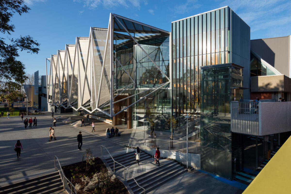 [The designers have] “visually and physically connected” the library to the broader campus, “through its glass entrance and western facade with new accessible ground level access for library users. It is a light, safe and secure focal point for campus users, day and night.” — Jury Citation, 2018 National ALIA Awards