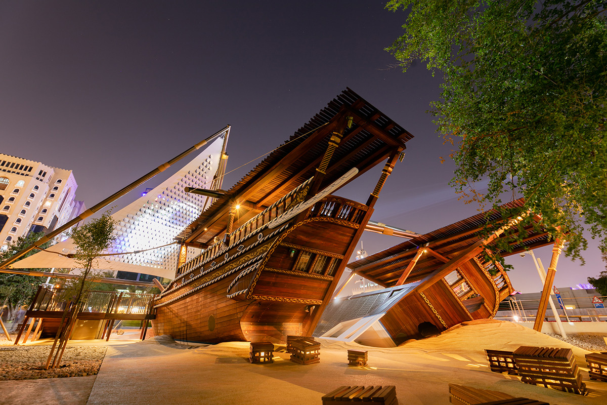 The Adventure Ship has been created as an authentic recreation of a dhow, (a traditional Qatari ship), in the harbour adjacent the Museum of Islamic Art. Handmade wood carvings decorate the exterior of the ship with a plethora of patterns and colours to enhance the authenticity of the ship.