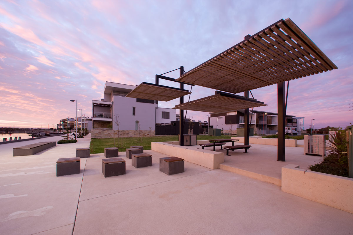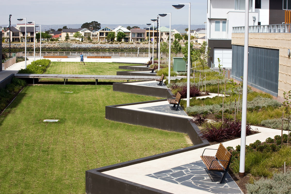 Newport Quays was a new medium density development in Port Adelaide. TCL provided landscape and urban design masterplanning of the first stage of this large harbour-side redevelopment. Elements include a waterfront promenade, three ‘finger’ parks between apartment blocks, gathering spaces adjacent the promenade, viewing decks over the water, and streetscape treatments.TCL worked closely with Cox Architects and the client, Brookfield Multiplex and Urban Construct, to achieve an urban environment that provides a wide variety of spatial experiences within this reasonably dense development.Custom-designed seating and shelters provide special places of interest for residents and the public. Throughout the site, richly textured and coloured plantings complement the architecture and urban spaces.TCL also worked on Stage 2A, which included a large park dedicated to the local Aboriginal cultural heritage, Lartelare.