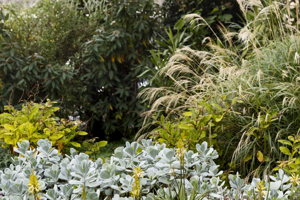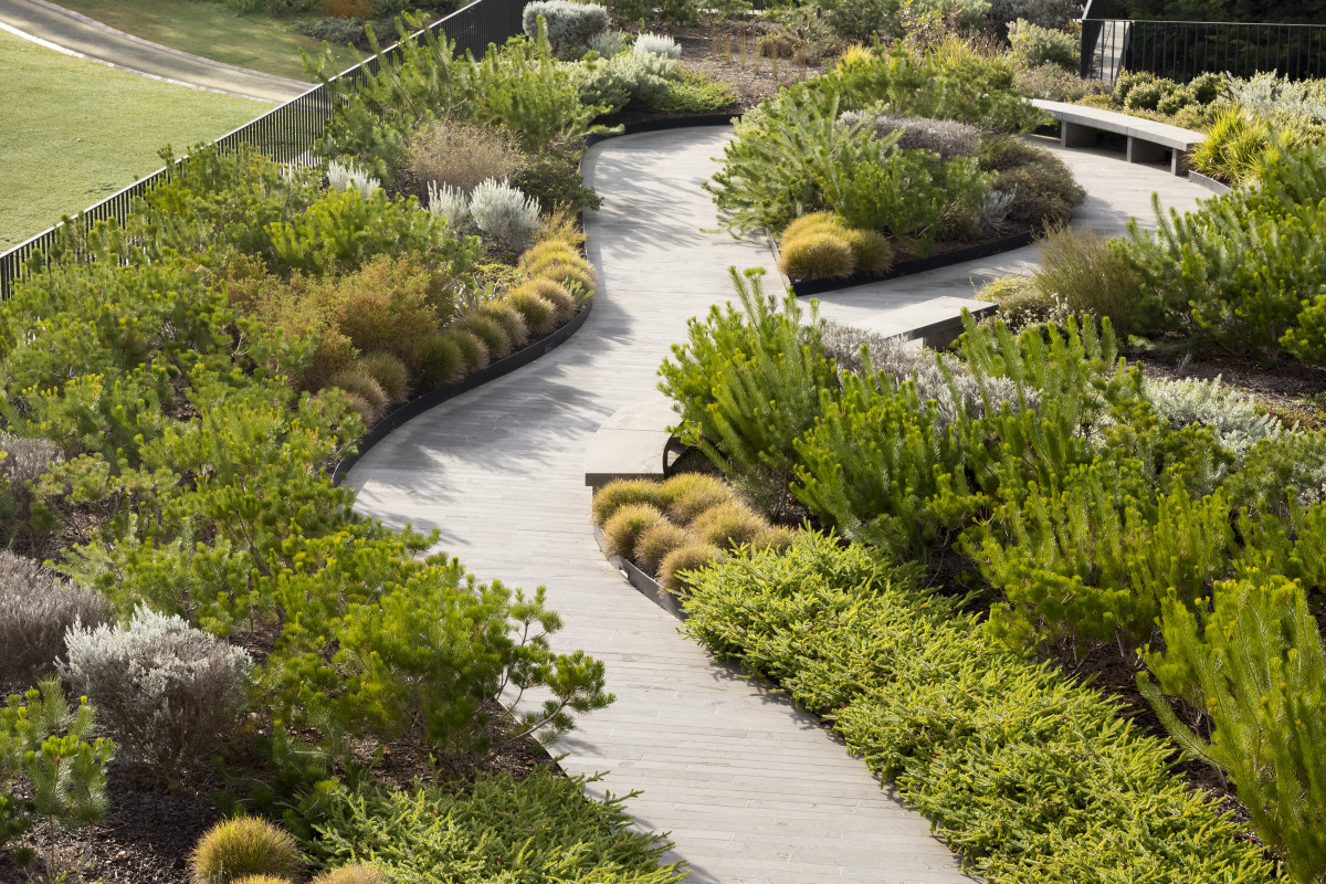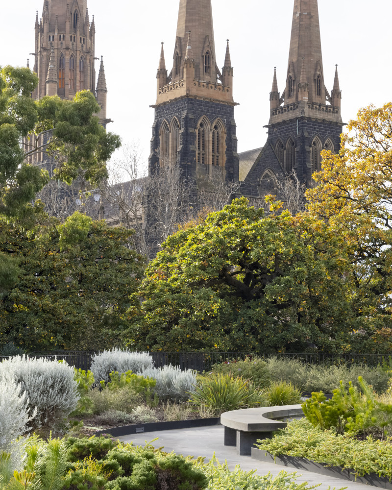 The roof garden features a serpentine bluestone path that weaves through drifts of silver Eremophila nivea and Eremophila glabra, that structure a rich mosaic of native shrubs, grasses and wildflowers. These drifts of striking silver shrubs are sculpted to evoke drifting clouds and to provide an informal yet repetitive foreground to the distant views to St Patricks Cathedral.