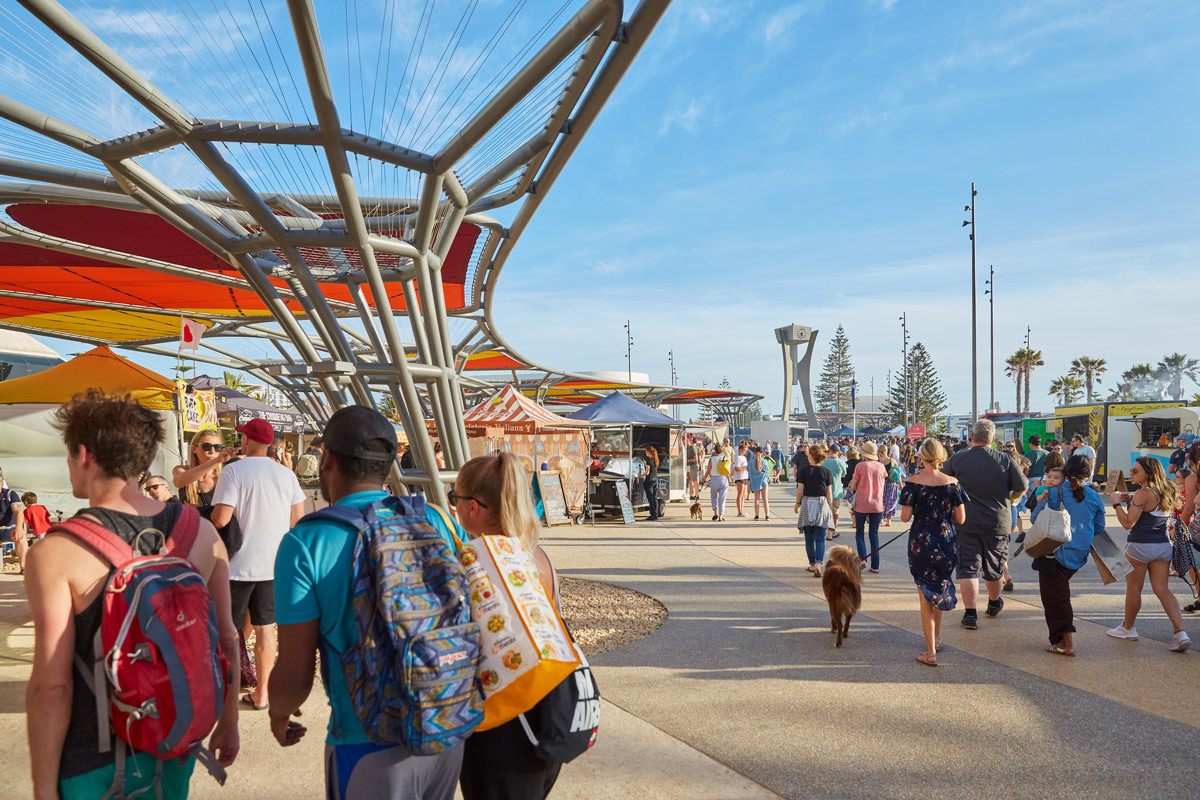 Formerly a carpark, Scarborough Square is a new civic space that sits between the beach and The Esplanade. The square is the primary point of arrival to the foreshore and includes a set of iconic shade arbours designed by Perth practice Chaney Architects. The colourful arbours were inspired by the ‘voronoi’ structure found in natural systems and geometries, including dragonfly wings, and the colour pattern was developed in collaboration with Aboriginal Artist Sharyn Egan.