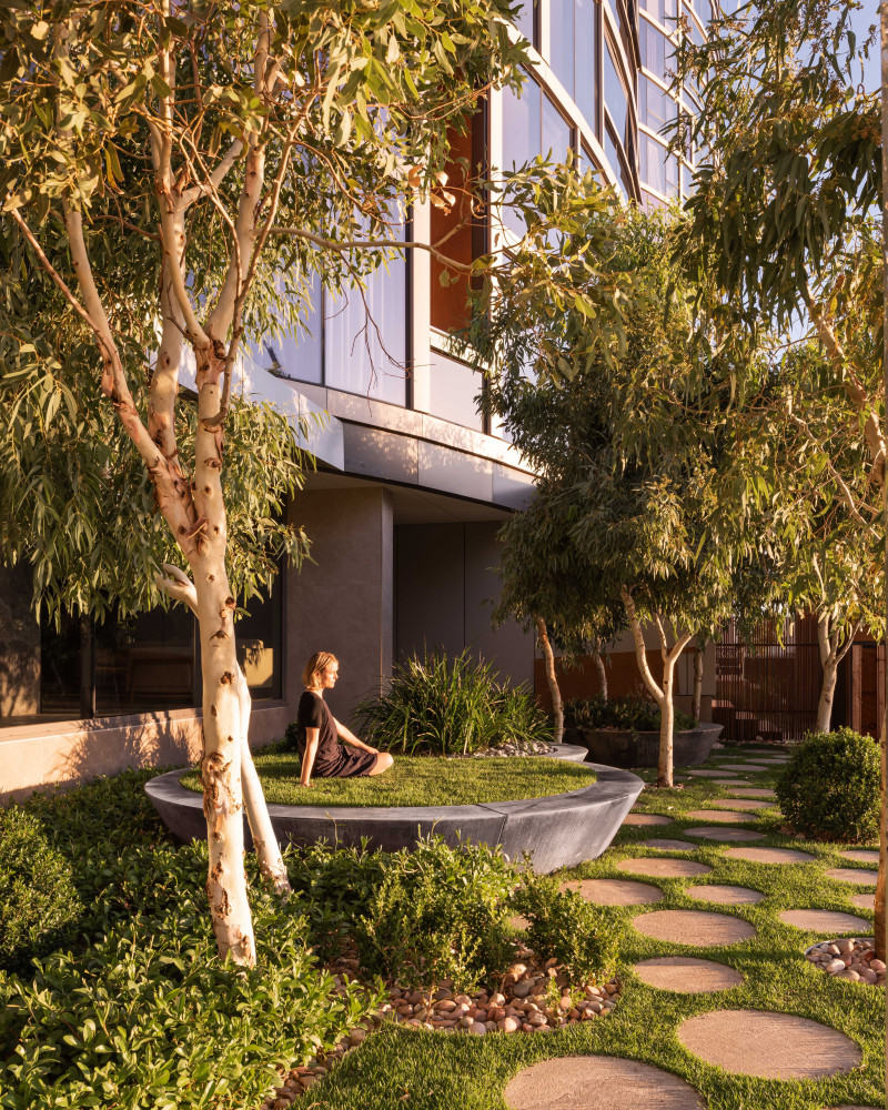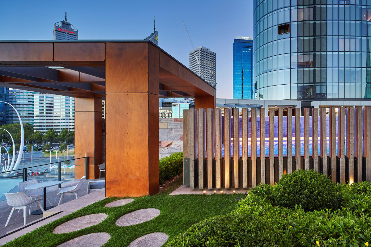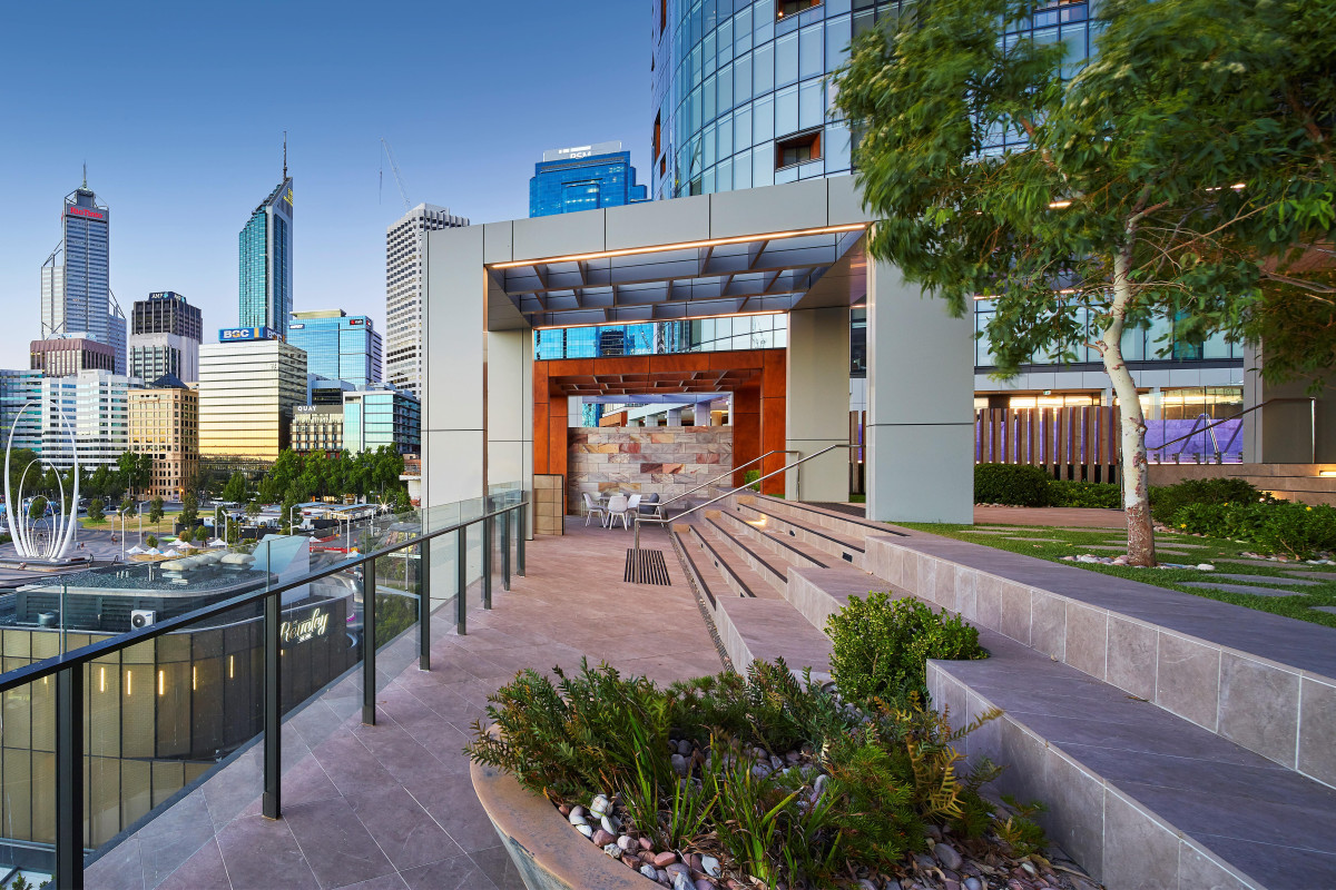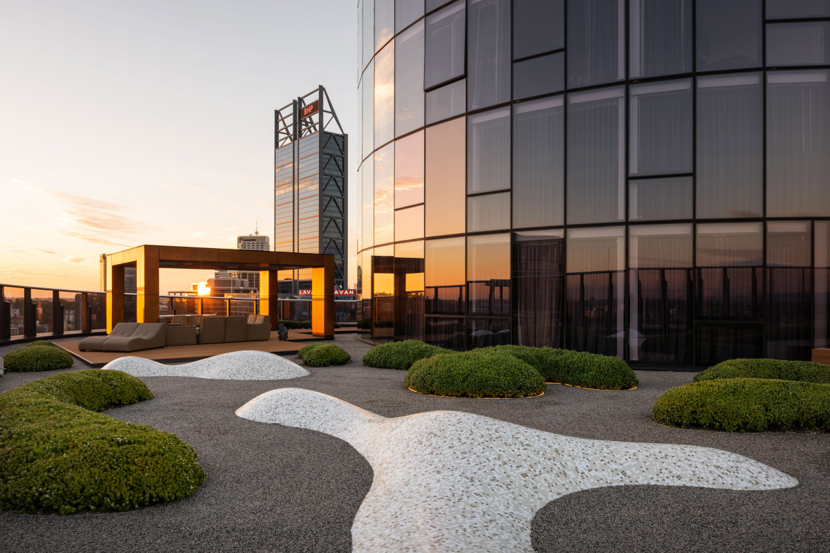The landscape design of the development takes its inspiration from the wondrous plants and landscapes of the South -West of Western Australian, of which the Swan River, Perth and its surrounds are within. This region is known as one of 34 botanical ‘hotspots’ in the world, and the only one in Australia. Abstracted and graphic designs for the different levels of the development express various landscape types, such as the coastal dunes, the sinuous Swan River and floral displays in the surrounding Perth region. These bold landscape spaces while being immersive for the occupants are also highly visible when viewed from above.